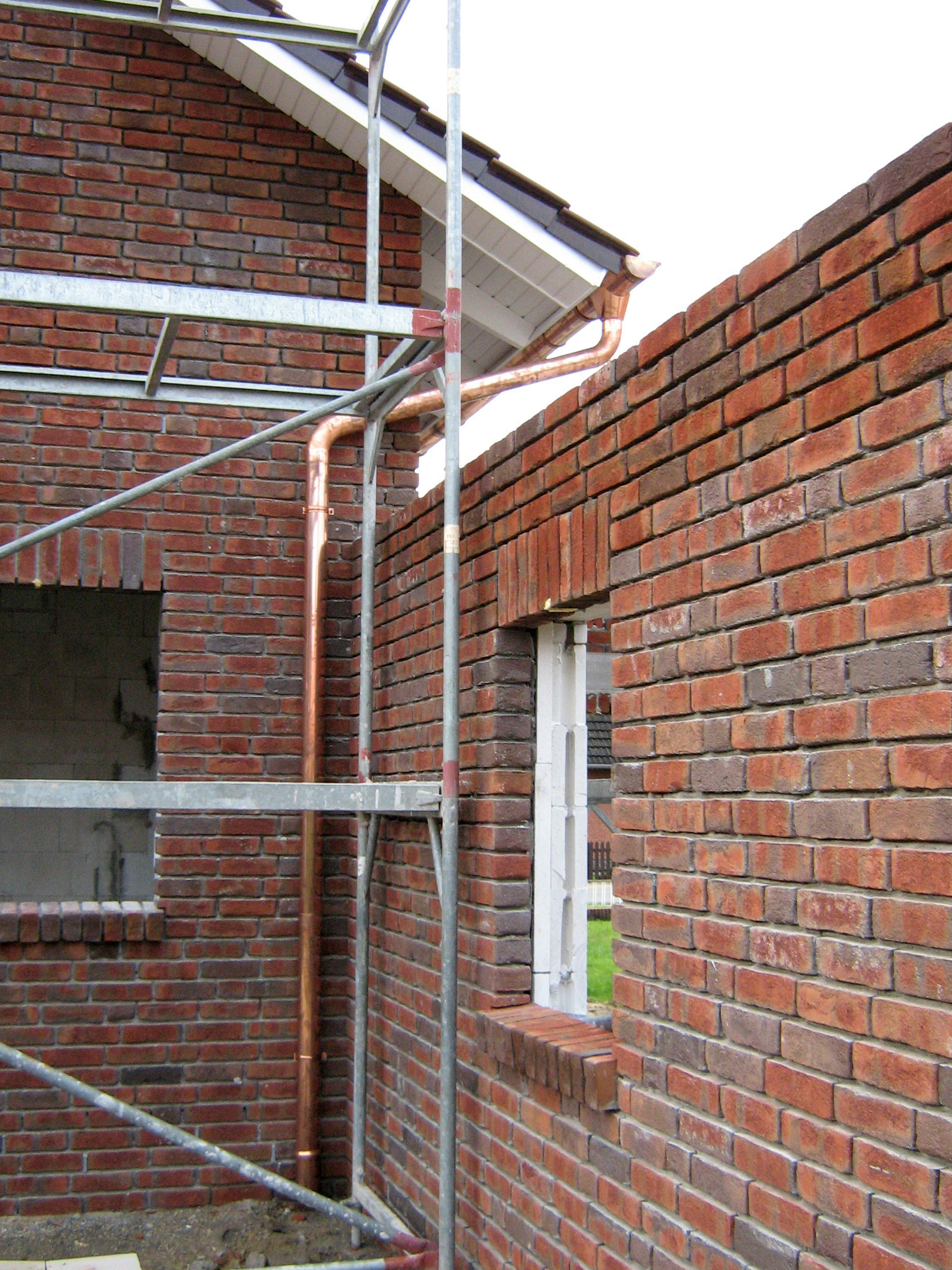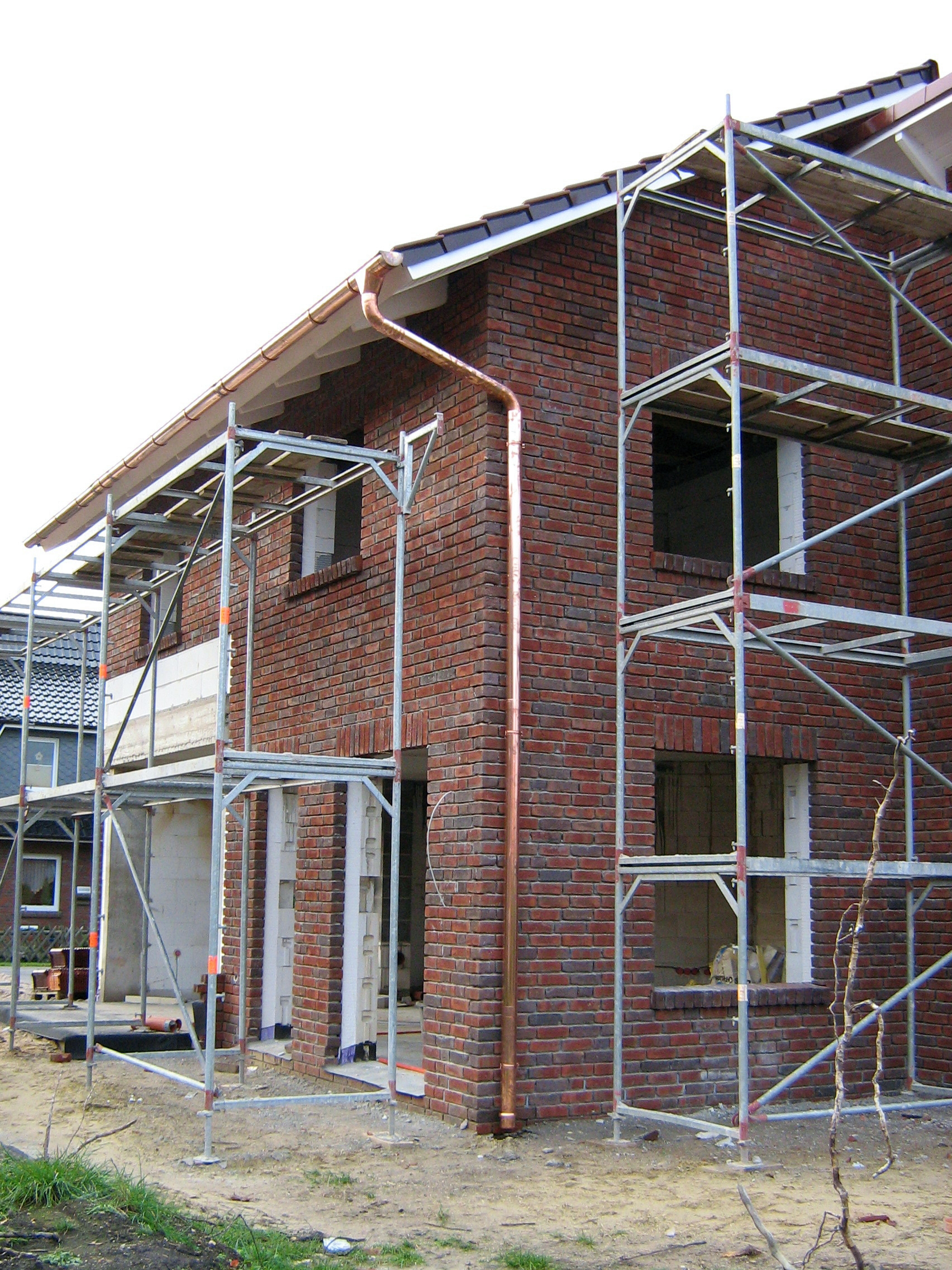 Auch die Fallrohre (zumindestens die beiden an den Hauptdächern) waren schon angebracht. Hier hatte ich ja zuerst ein wenig Sorge, denn wir hatten mit dem urspünglich vorgesehenen Dachdecker abgesprochen, daß Fallrohre und alle Dachanschlußschienen aus Kupfer sein sollten. Das hat aber auch mit dem "neuen" Dachdeckerbetrieb ohne Probleme geklappt.